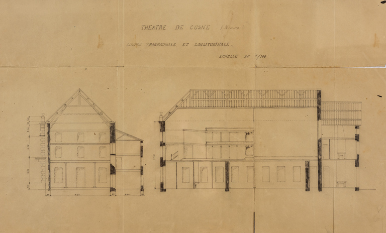 Théâtre de Cosne (Nièvre). Coupes transversale et longitudinale. Dessin (tirage), s.n. S.d. [1922 ?]. 39 x 66,5 cm, 1/100.Lieu de conservation : Archives municipales, Cosne-Cours-sur-Loire - Cote du document : 4 M 30 -