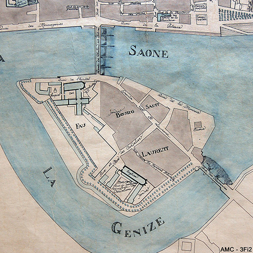 Plan de Chalon [détail de l'île Saint-Laurent]. Dessin, par Joseph Baillet. 1815. Échelle de 3 cm pour 500 m ou de six dixièmes de millimètre pour un mètre.Lieu de conservation : Archives municipales, Chalon-sur-Saône - Cote du document : 3Fi2