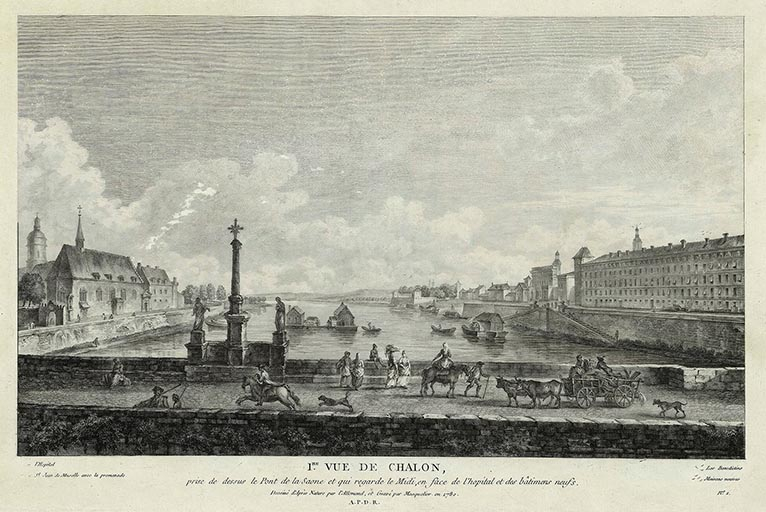 Chalon-sur-Saône.- Première vue prise de dessus le pont de la Saône et qui regarde le midi, en face de l'hôpital et des bâtiments neufs. Dessin (ou estampe), par Lallemand. 1780. 50,5 X 33 cm, sans échelle.Lieu de conservation : Archives départementales de Saône-et-Loire, Mâcon - Cote du document : 2 Fi 1/203 -