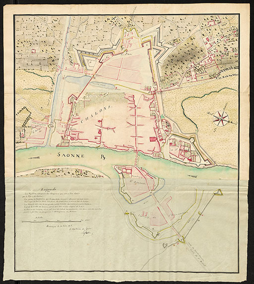 [Chalon-sur-Saône, plan et profils]. Dessin (plume, lavis), par Legrand. 1785. Échelle de deux pouces pour 100 toises.Lieu de conservation : Ministère de la Défense, Service historique de la Défense, Vincennes - Cote du document : 1 VH 558 -