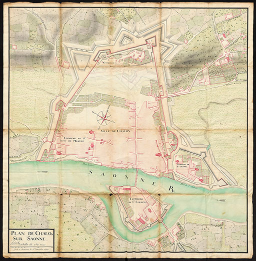 Plan de la ville et citadelle de Chalon sur Saône. Dessin (plume, lavis), sn. S.d. [1638-1685].Lieu de conservation : Ministère de la Défense, Service historique de la Défense, Vincennes - Cote du document : Atlas 98 -