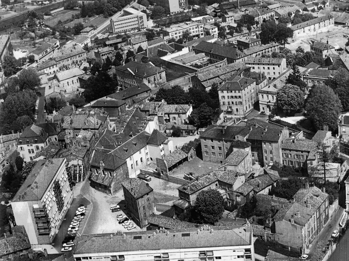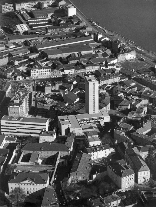 Vue aérienne du centre-ville de Mâcon (02/02/1972). Photographie par Georges Thomas. 1972. 24 x 18 cm.Lieu de conservation : Archives municipales, Mâcon - Cote du document : 4 Fi 3352 -