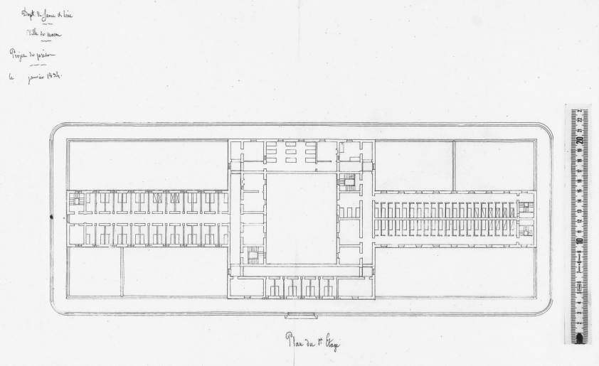 Projet d'extension de la prison de Mâcon. Plan du premier étage. Dessin. janvier 1834.Lieu de conservation : Archives nationales, Pierrefitte-sur-Seine - Cote du document : F 21 1900, n°3085 -
