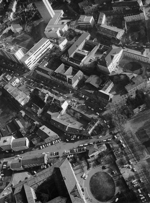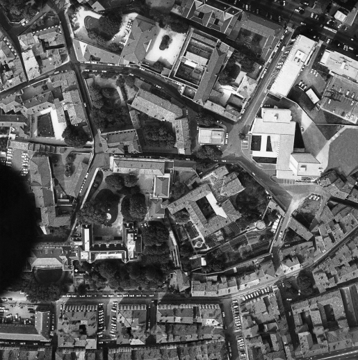 Vue aérienne du centre-ville de Mâcon (17/09/1973). Photographie par Georges Thomas. 1973. 24 x 18 cm.Lieu de conservation : Archives municipales, Mâcon - Cote du document : 4 Fi 6432 -