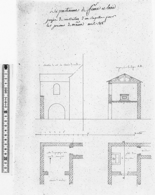 Plans, élévation et coupe et de la chapelle de la prison de Mâcon (projet). Dessin. Avril 1818.Lieu de conservation : Archives nationales, Pierrefitte-sur-Seine - Cote du document : F 21 1900, n°3067 -