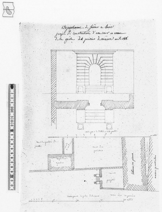 Plan et élévation de la cour et du portail en avant de la geôle de la prison de Mâcon (projet). Dessin. Avril 1818.Lieu de conservation : Archives nationales, Pierrefitte-sur-Seine - Cote du document : F 21 1900, n°3067 -