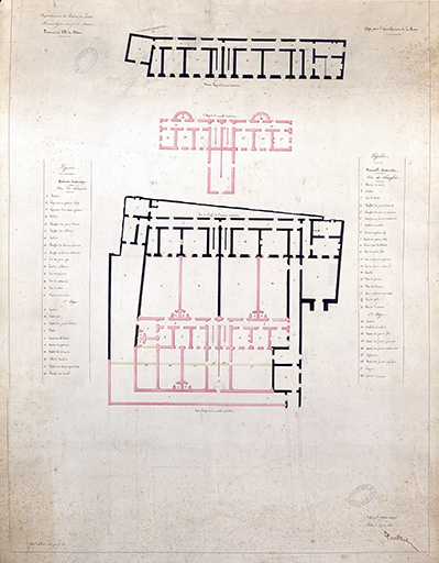 Projet pour l'agrandissement de la prison de Mâcon. Plans du rez-de-chaussée et du premier étage. Dessin à la plume par André Berthier. 13 juin 1853. 1/200.Lieu de conservation : Archives départementales de Saône-et-Loire, Mâcon - Cote du document : 4 N 35, n° 3 -
