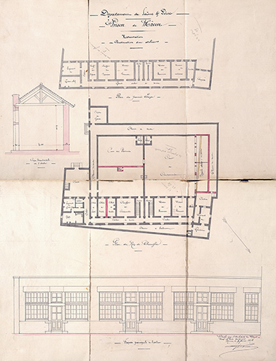 Prison de Mâcon : restauration et construction d'un atelier. Dessin à la plume par Jean-Etienne Giroud. Plans du rez-de-chaussée et du premier étage, coupe et élévation. 6 févier 1873. [échelles multiples, non précisées].Lieu de conservation : Archives départementales de Saône-et-Loire, Mâcon - Cote du document : 4 N 35, n° 8 -