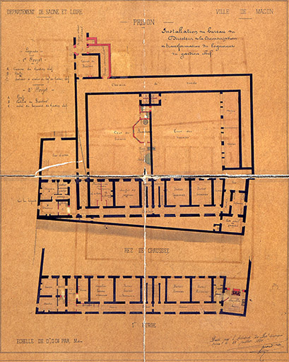 Archives départementales de Saône-et-Loire : 1 Y 267. Bâtiment.- Travaux sur les barreaux des croisées sciés (1820-1822, 1837) ; projet d'aménagement pour éviter les évasions (1904) ; travaux à l'atelier des femmes et plancher des dortoirs (1930) ; aménagement de cellules (1931) ; élévation du mur de l'atelier des détenus (1931) ; réfection de l'installation de la lumière, des sonneries et de la toiture (1933) ; protection contre l'incendie (1936). 1820-1936.Lieu de conservation : Archives départementales de Saône-et-Loire, Mâcon - Cote du document : 1 Y 267