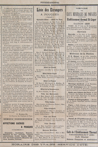 Pougues-Saint-Léger / G. de La Fargue. Lithographie. 50 x 32 cm. In : Les eaux en goguettes. A-propos d'hydrologie. [Nevers] : Mazeron Frères, [vers 1887]. 2 p.Lieu de conservation : Archives départementales de la Nièvre, Nevers - Cote du document : Collection du docteur François (non cotée) -