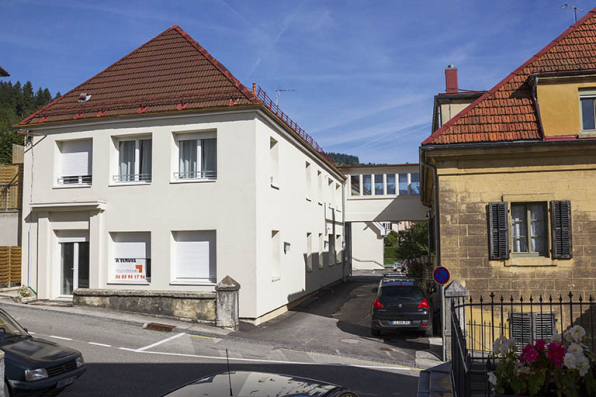 Usine : façades antérieure et latérale droite du premier corps de bâtiment, avec la passerelle.